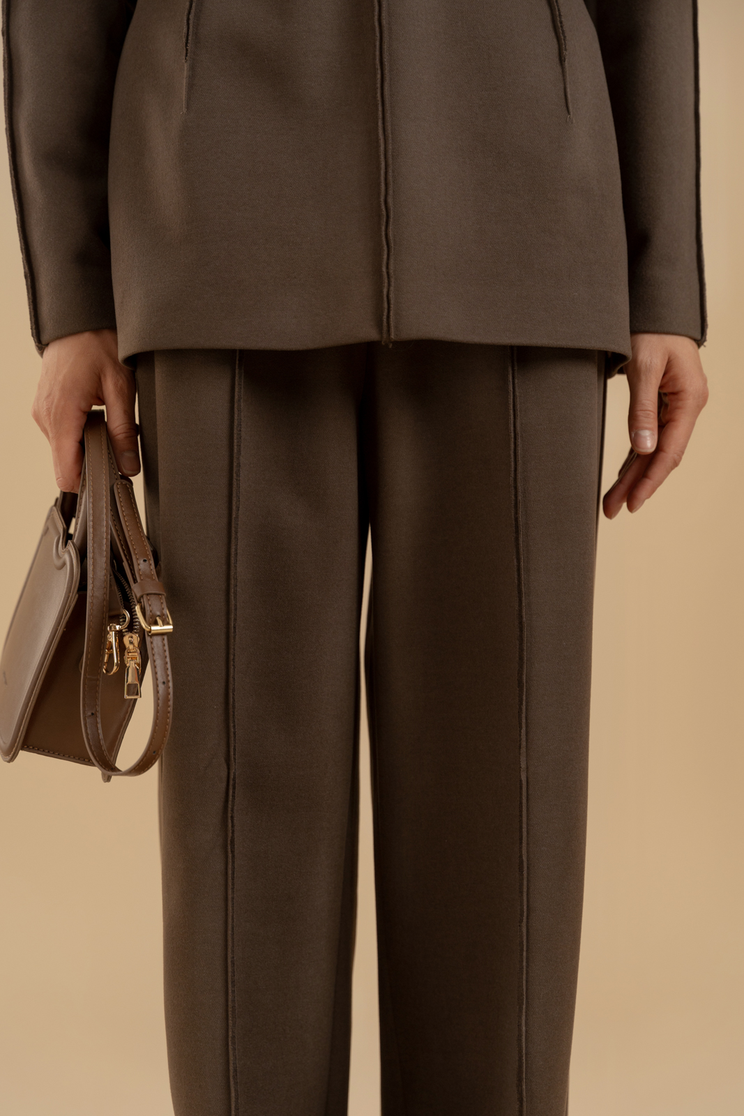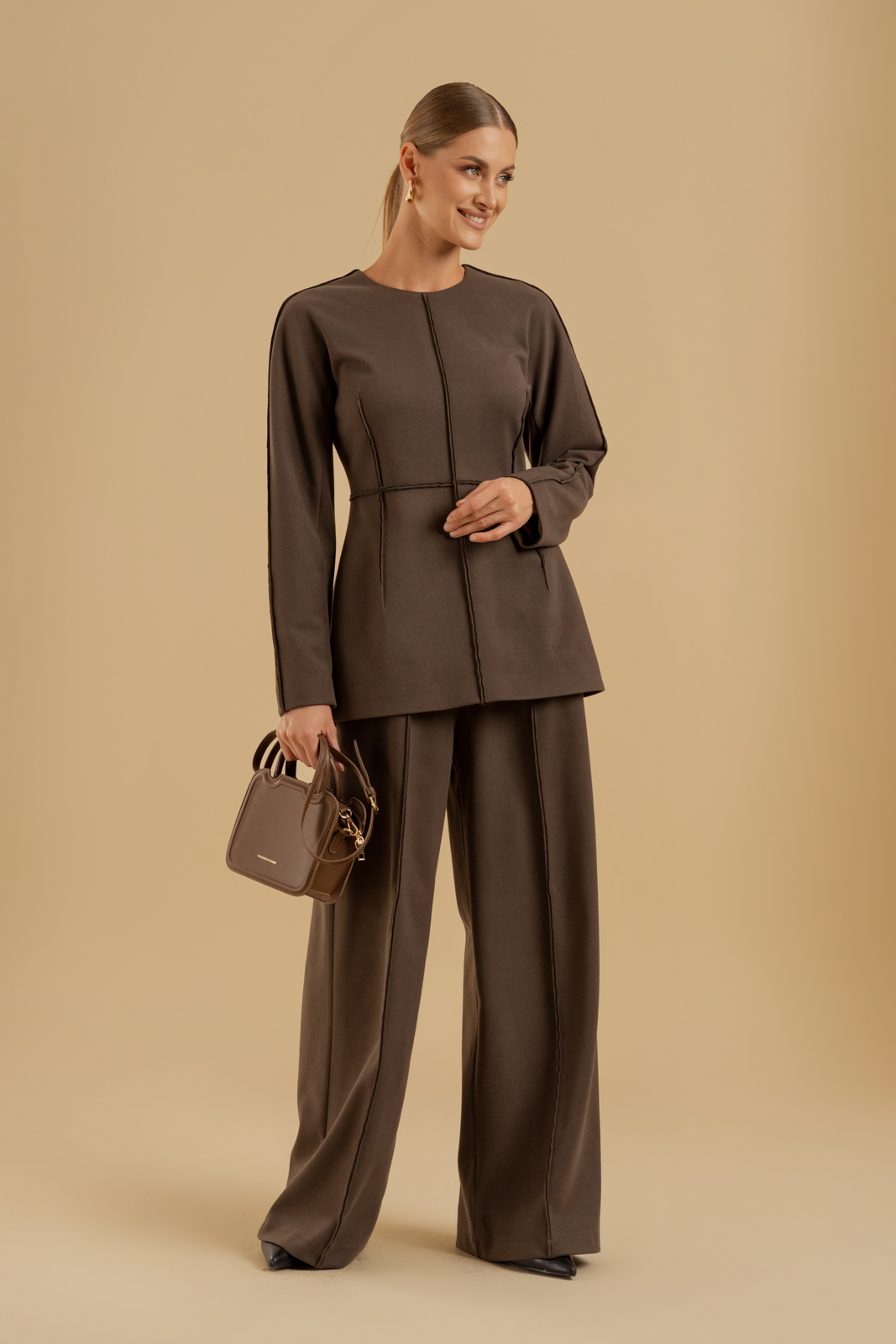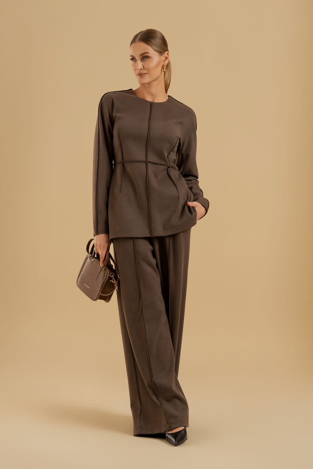 Комплект женский двухпредметный из мягкого трикотажного полотна приталенного силуэта. Блуза - на трикотажной подкладке. Вырез горловины - неглубокий, округлой формы. Рукава - цельнокроеные с ластовицами. По спинке в среднем шве - застежка молния. Брюки - свободного покроя. Пояс - отрезной с эластичной тесьмой. В боковых швах имеются карманы. По передним деталям выполнены вертикальные подрезы. Изделие декорировано отделочными швами с необработанными срезами.
