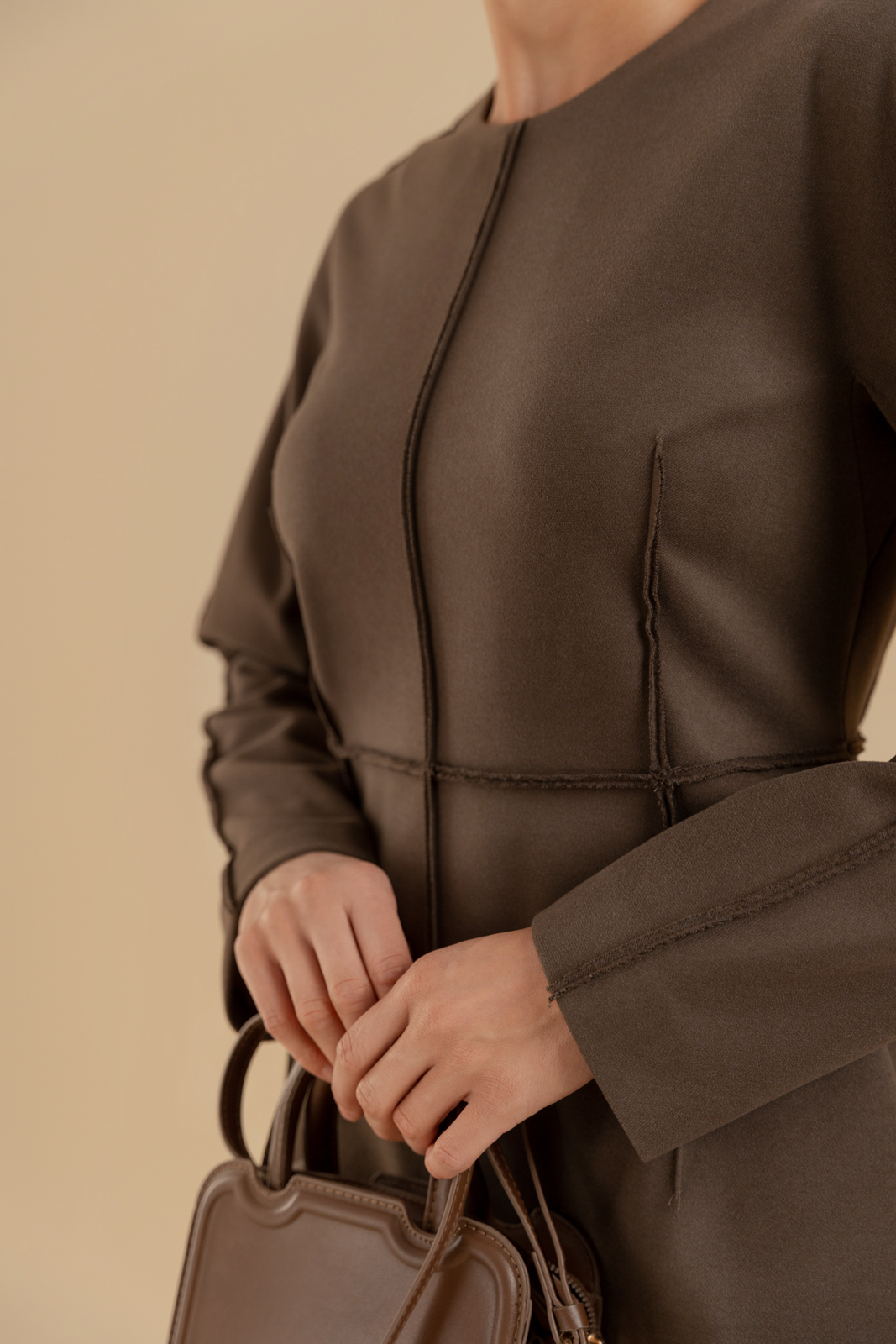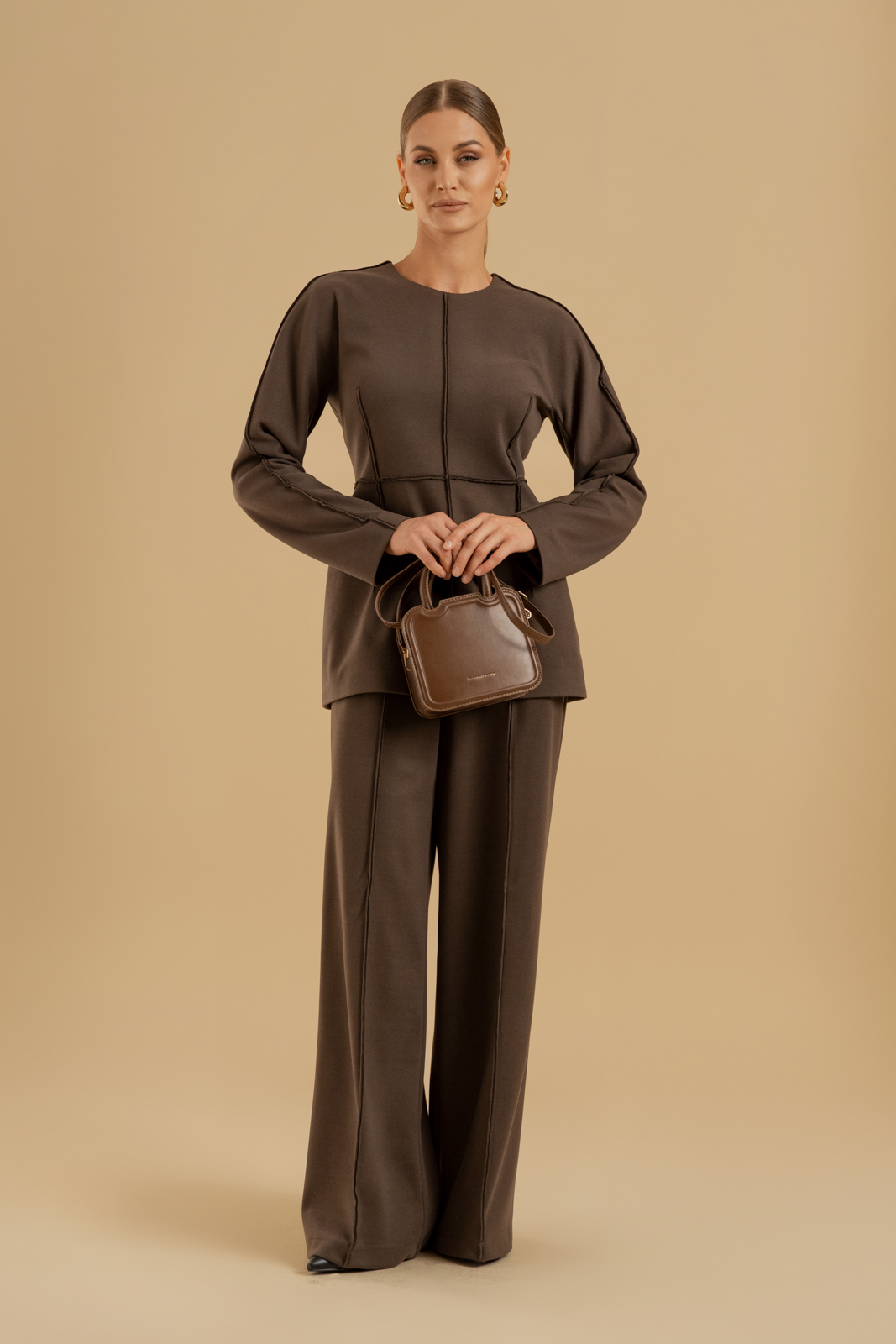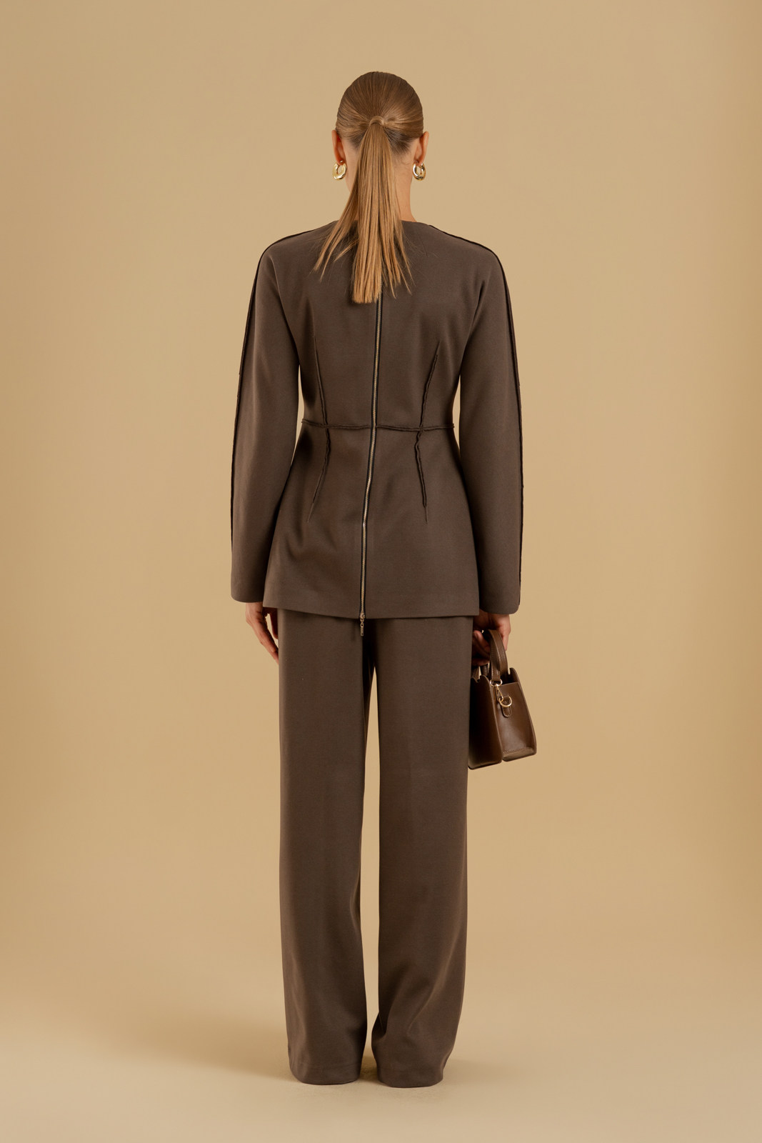 Комплект женский двухпредметный из мягкого трикотажного полотна приталенного силуэта. Блуза - на трикотажной подкладке. Вырез горловины - неглубокий, округлой формы. Рукава - цельнокроеные с ластовицами. По спинке в среднем шве - застежка молния. Брюки - свободного покроя. Пояс - отрезной с эластичной тесьмой. В боковых швах имеются карманы. По передним деталям выполнены вертикальные подрезы. Изделие декорировано отделочными швами с необработанными срезами.