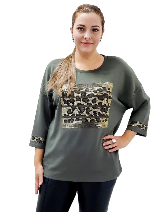 Фото Женская одежда, -Свитера, Джемперы, Пуловеры Оливковый трикотажный джемпер с леопардовым принтом