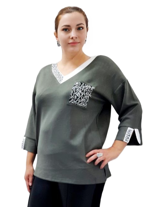 Оливковый трикотажный полувер со стразами 54-60