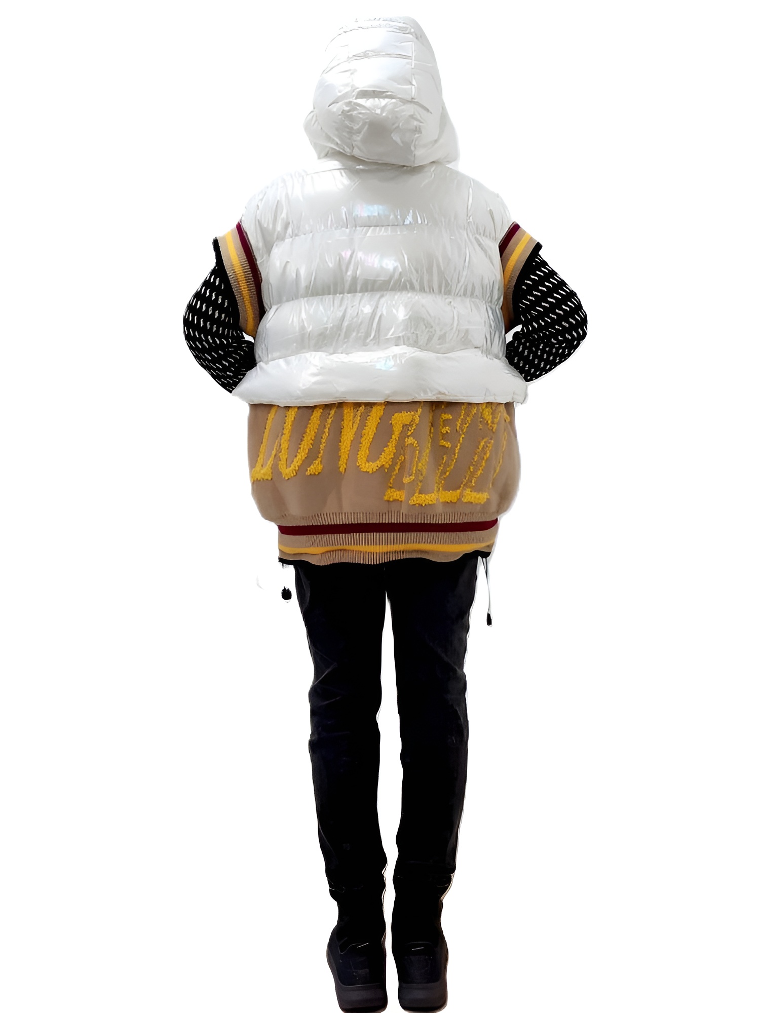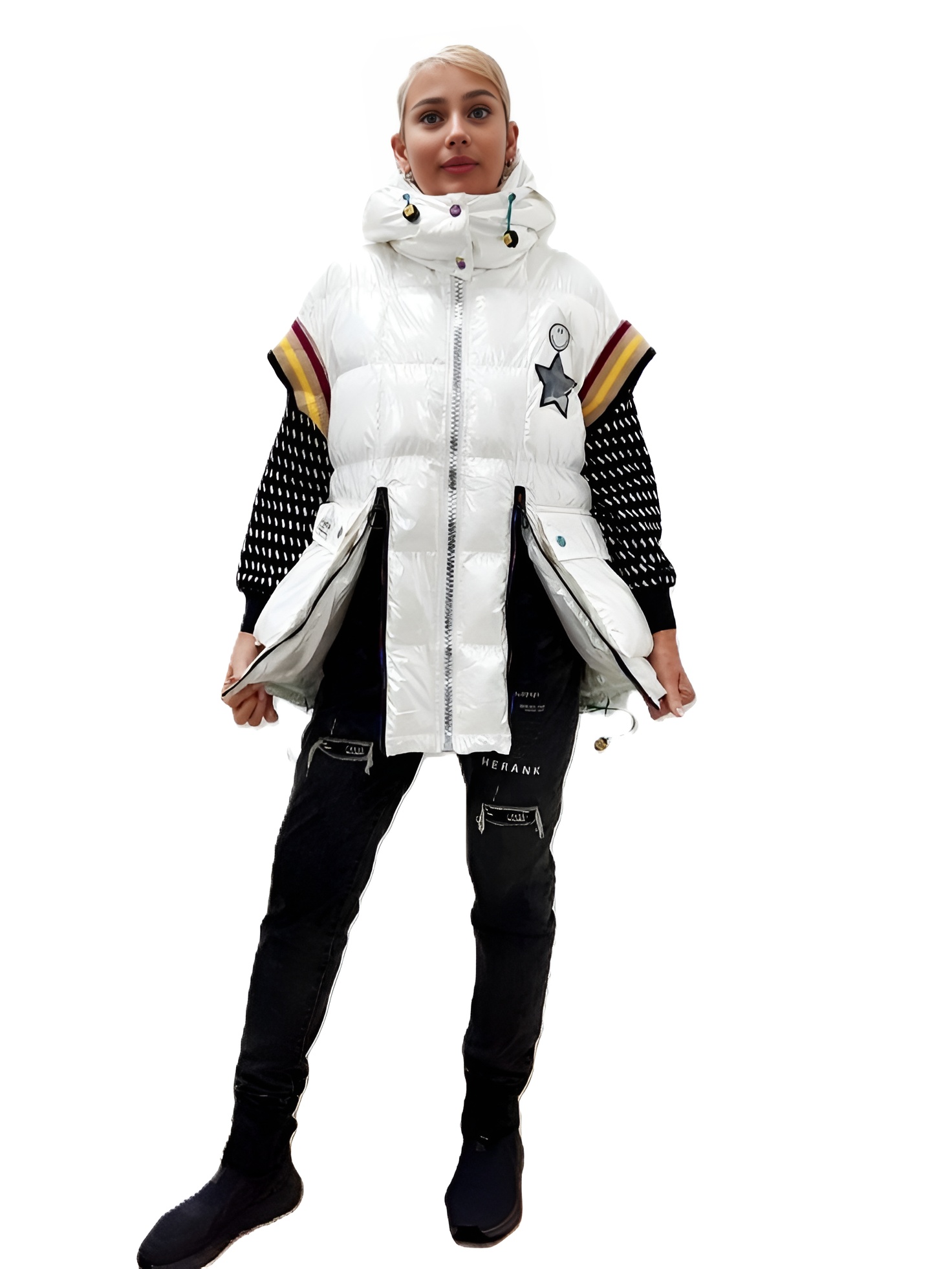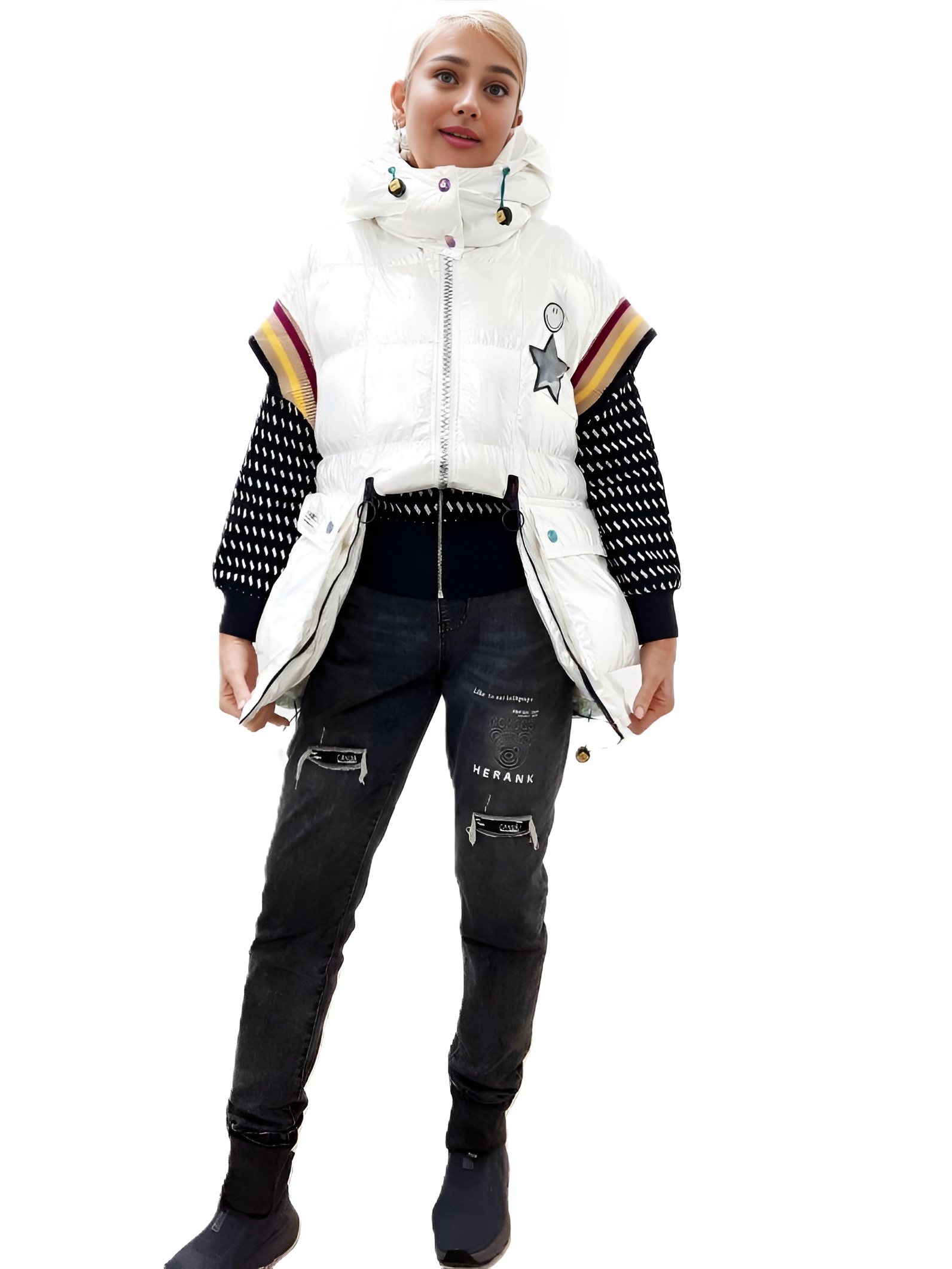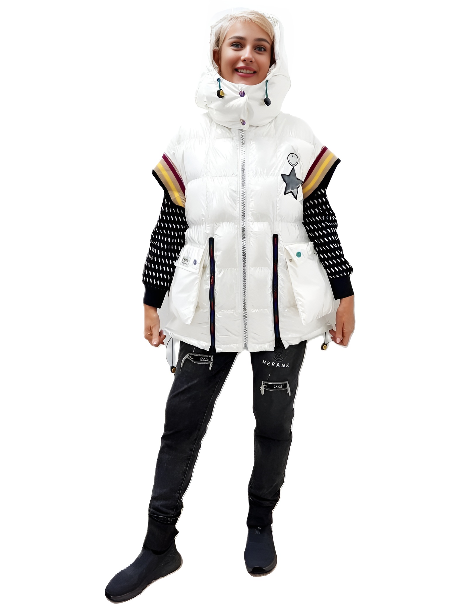 Ослепительно белый цвет: Белый цвет жилета освежает образ, делая кожу сияющей.
