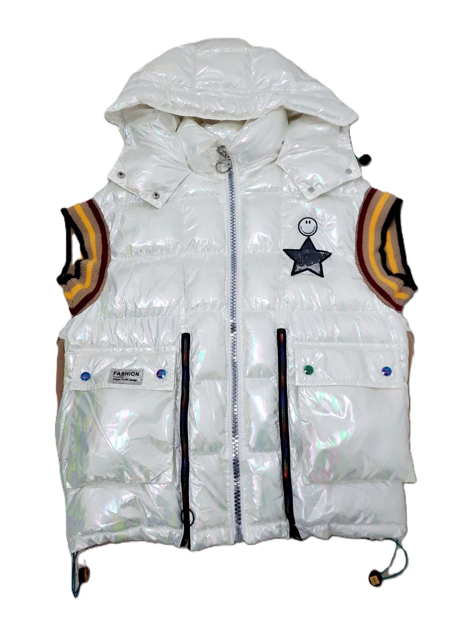Актуальный дизайн: Накладные карманы, цветные кнопки и яркая трикотажная отделка придают жилету современный и стильный вид. Шикарный "тракторный" замок с крупными звеньями добавляет изюминку.